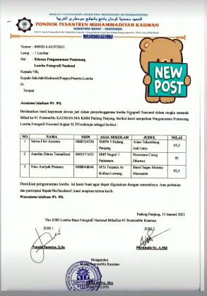 Nico Azriyah Pratama kembali mendulang penghargaan lomba fotografi di tingkat nasional. Kini siswa MTs Terpadu Ar-Roihan Lawang yang beberapa waktu lalu mendapatkan juara 1 lomba fotografi PPIptek Kemenristekbrin, kembali mendapatkan juara 3 pada lomba fotografi tingkat nasional bertema lingkungan yang diselenggarakan oleh Pondok Pesantren Muhammadiyah Kauman Sumatera Barat.